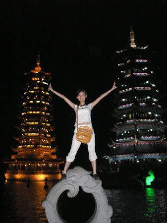 桂林兩江四湖的夜景確實醉人,瞧這MM得意的在榕湖畔撐起金銀雙塔。