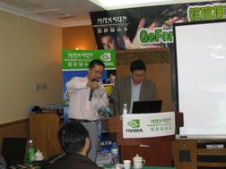 NV廣州區銷售經理楊成發表講話,楊先生用極富感染力的演講方式向經銷商家講述NV專業顯卡Quadro和NV的CUDA技術,及產品的規劃、性能特點以及市場優勢。
