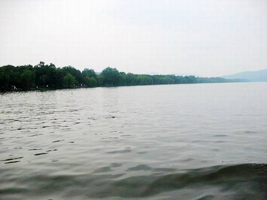 西湖水 我們坐上游船泛舟西湖,西湖的水很綠,綠得像一塊翡翠。波光凌凌的湖面籠罩著一層薄薄的水汽,宛若輕柔的面紗般,朦朧了西湖國色天香的美麗容顏。