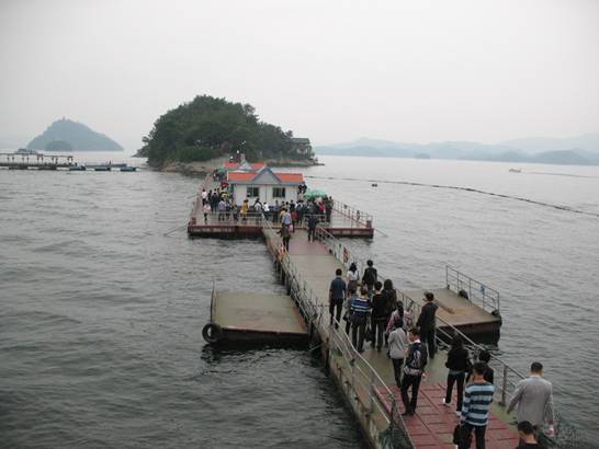 千島湖 我們一行隨導游坐船來到了湖上,放眼望去,整個湖面相當的清澈,千島競秀,群山疊翠,若隱若現,朦朦朧朧。湖面上,一座座蒼翠欲滴的小島星羅棋布,遠處水天相接處煙波浩渺、大氣磅礴,近處湖水顯出深碧色,像一塊碩大無比的翡翠,湖邊細浪在微風的吹拂下輕柔地拍打著岸邊, 令人心曠神怡。 稍作休整我們到達游湖的第一站鎖島。鎖島的面積不大,但卻是一個鎖的天地。整個島上,設置了多個掛鎖許愿的區域,游客通過掛開心鎖、同心鎖、友誼鎖、吉祥鎖、功德鎖等等,把對生活的美好祝愿留在鎖上。