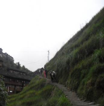 龍脊梯田區(qū)域內(nèi)最高海拔880米,最低海拔380米,坡度大多在26-35度之間,最大坡度達(dá)50度。汽車在窄小崎嶇的鄉(xiāng)村公路上盤旋,之字形的急轉(zhuǎn)彎繞過了一個(gè)又一個(gè),汽車負(fù)重爬坡的吼叫一陣又一陣,七十二道彎在蒼翠的山坡上掛上了九曲回腸,那碧綠清徹的溪流便漸漸遠(yuǎn)離而去。一路相伴的只有層層疊疊的梯田,往下看,一個(gè)個(gè)山峰酷如裝滿米谷的糧囤,那梯田就象蘆席編制的圍圈一個(gè)勁地往上竄;抬頭望,那層層越越的梯田如同見風(fēng)旺燃的火焰,跳動(dòng)著,盤旋著,仿佛要把美麗送上云天。從停車場到平安寨還有二十來分鐘的路程。或許是要考驗(yàn)梯田“朝圣者”的虔誠,那山路更顯得崎嶇險(xiǎn)峻。開頭的一段還是略帶坡度的水泥路,寬闊,平緩,又有溪流“叮咚”相伴。一過了那座蓋著風(fēng)雨廊的橋亭,能插足的就只有巖縫草間。