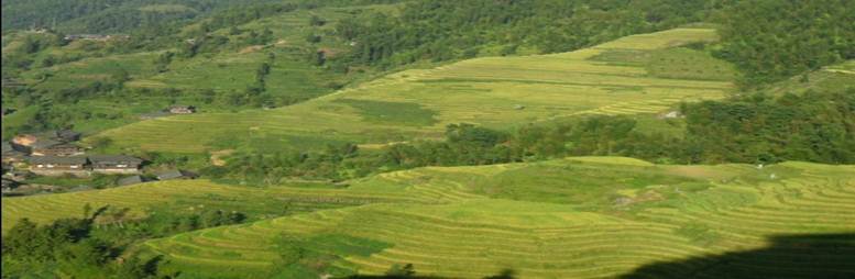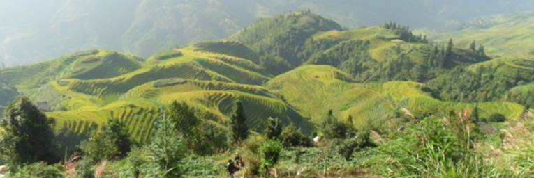 南國山區(qū)處處有梯田,可是像龍脊梯田這樣大規(guī)模的集中實(shí)在是世所罕見。從流水湍急的河谷,到白云繚繞的山巔,從萬木蔥蘢的林邊到山石嶙峋的削壁陡崖前,只要是有泥土的地方,那梯田便連綿不絕,疊入云天。梯田塊多而地小,田塊之多,逾千上萬,而地塊之小,連牛犢轉(zhuǎn)身也有點(diǎn)困難,最大的田塊不超過一畝,大多數(shù)是只能種一兩行水稻的“帶子丘”,最小的就小到“青蛙一跳跳過三塊田”。