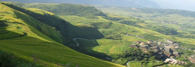 龍脊梯田之所以出名,就在于它的恢宏磅礴的氣勢。梯田如鏈似帶,從山腳盤繞到山頂,垂直落差達(dá)500米,小山如螺,大山似塔,層層疊疊,高低 錯(cuò)落。