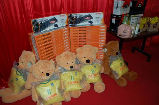 本次晚宴除開幾個大獎以外,也特意為到場的每一位經(jīng)銷商朋友準備了鼓勵獎,獎品分別為臺電U盤。攝像頭。鍵鼠套裝。電影票。抱抱熊等等,作為禮物送給了所有朋友。。