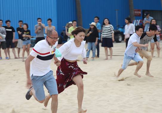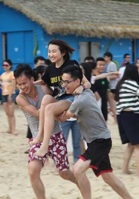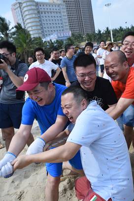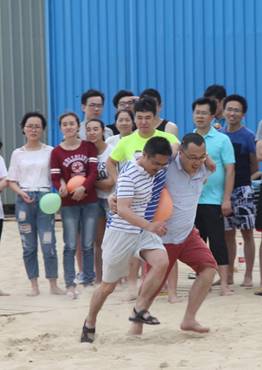 接下來是歡樂的趣味接力活動啦,這一環(huán)節(jié)講究的不僅是速度,隊(duì)員的配合也十分重要。雙人夾氣球、背人跑、雙人咬紙巾、抬人跑、轉(zhuǎn)圈跑,大家玩的不亦樂乎,加油聲、呼喊聲、笑聲充斥著整片沙灘!