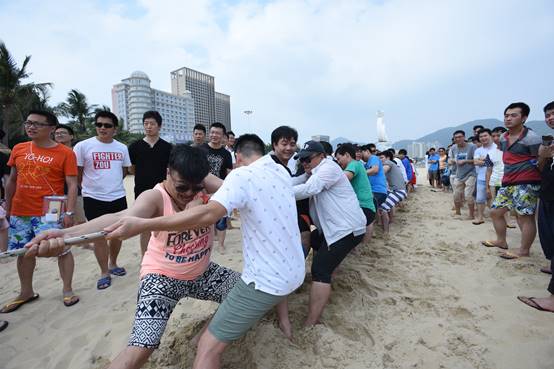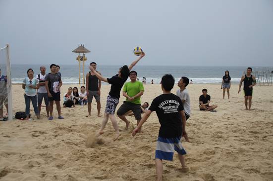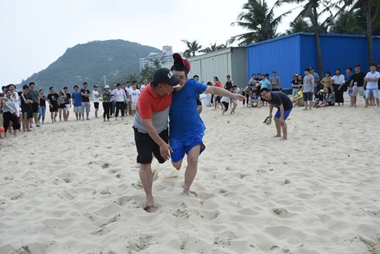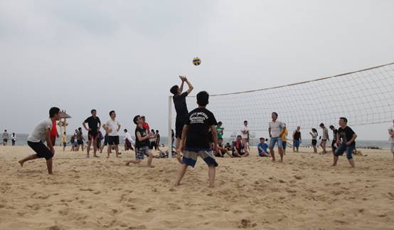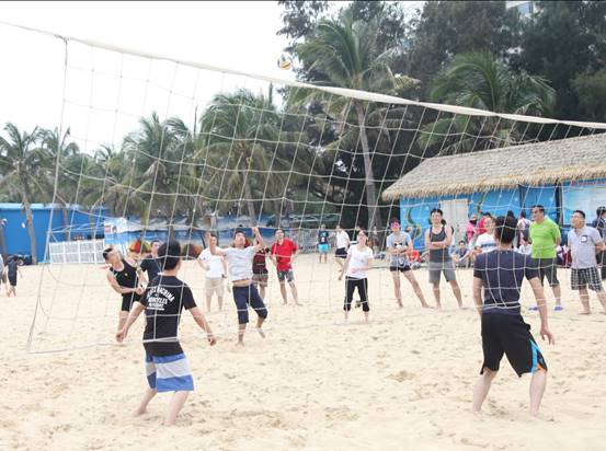 頭頂藍(lán)天,沐浴陽光,具有競技性的沙灘排球比賽開始了,大家光著腳板在金色柔軟的沙灘上,盡情的跳躍、翻滾、流汗,享受著這美妙的時(shí)光,充分釋放自己的好心情。