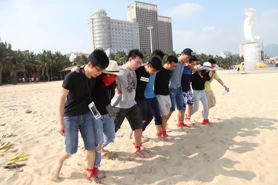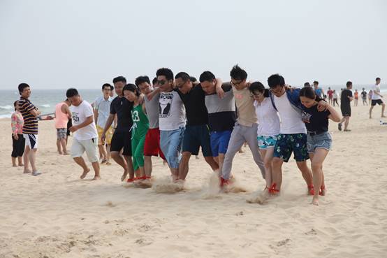 “一二、一二……”,陣陣呼喊聲傳來,拔河之后,考驗(yàn)?zāi)醯氖耸蛔惚荣愰_始了。隊(duì)員們肩并肩,邁著整齊有力的步伐,向著目標(biāo)沖去。盡管腳踝勒出了紅痕,盡管途中有摔倒,但是各組仍奮勇向前,成為海灘上最亮麗的風(fēng)景線。