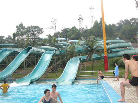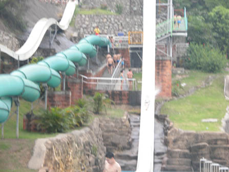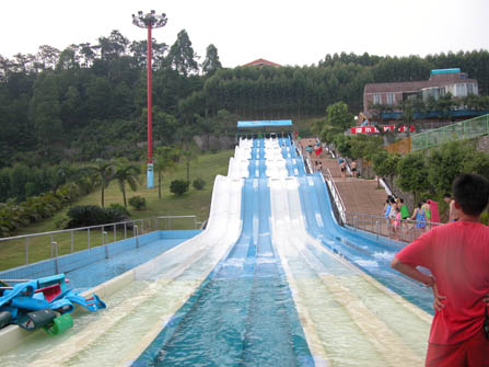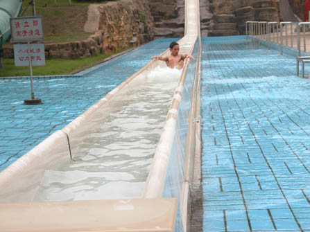 據(jù)不可靠的資料記載,此滑水道有七層樓那么高,也就是大概在25米左右,最高出和接地處據(jù)本人不完全的統(tǒng)計是成110度角,當你站到最頂點的高臺上的時候,要往下滑的的時候需具有大智大勇的氣魄; 大智,站在上面的時候,千萬的不要往下看看有多高,不然就肯定把你滑下去的決心減低到百分零點幾。(呵呵,說得有點夸張了,別給我嚇到),大勇,其實就是懵懵懂懂的沖下去,根本就不知道自己干了些什么之類的。