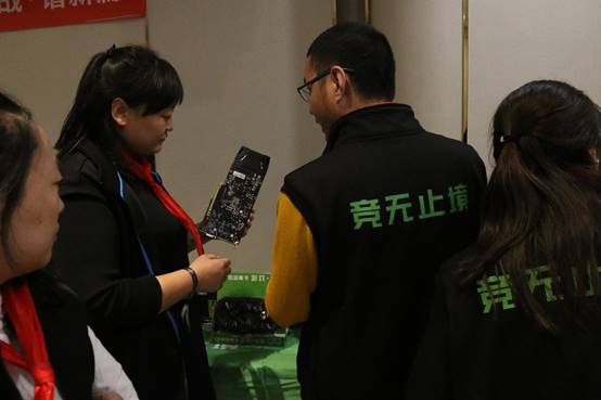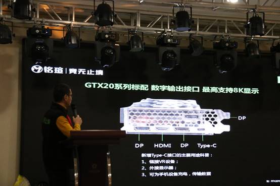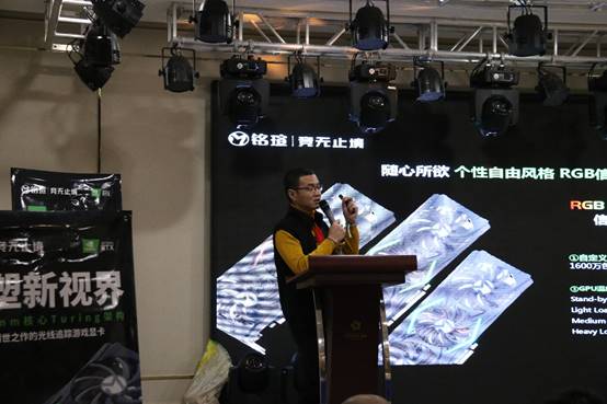 會議現(xiàn)場,展示了系列顯卡,新一代搭載英偉達圖靈架構(gòu)的RTX 20系列顯卡,具有第四代太極陰陽散熱系統(tǒng)、RGB燈效、定制背板、全新太極扇葉等多項功能,保證玩家在享受游戲刺激時仍然保持顯卡溫度低狀態(tài),滿足高端網(wǎng)吧的業(yè)務(wù)需求。現(xiàn)場的小伙伴們也迫不及待地進行了體驗。