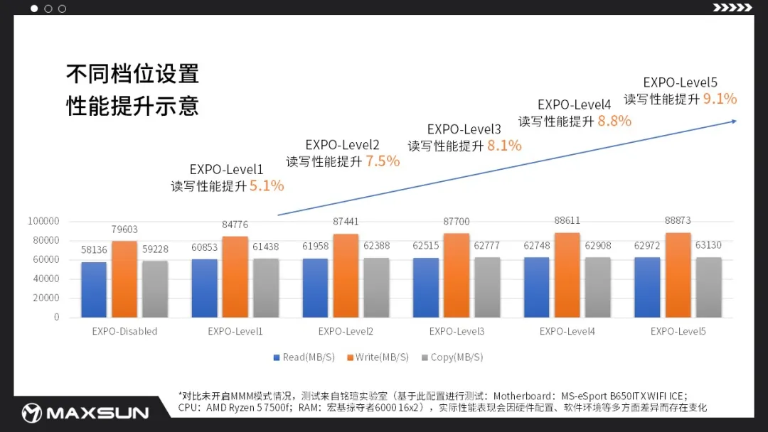 據銘瑄實驗室實測,開啟MMM模式Level5后對比未開啟MMM模式,讀寫性能提升9.1%,延遲減少14.8%,性能提升表現卓越(注:實際性能表現因硬件配置、軟件環境等多方面差異而存在變化,因架構差異原因,銳龍8000系列不支持該功能)。