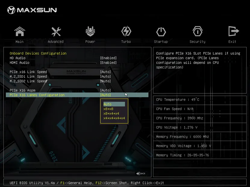AMD B650芯片組提供PCIe 16X通道拆分功能,但大多數主板只能支持2個8X拆分,甚至有部分主板不支持此功能,銘瑄在此基礎上進行優化,提供3個PCIe 16X通道拆分模式,滿足用戶不同的需求。3個PCIe 16X通道拆分模式分別為:X8+X8、X8+X4+X4和X4+X4+X4+X4,用戶可通過BIOS頁面中Advance(高級)—chipset Configuation(芯片配置)—PCIe X16 Lanes Configuration(PCIe X16通道配置)來設置此功能,從而根據自身需求更好地分配PCIe資源。